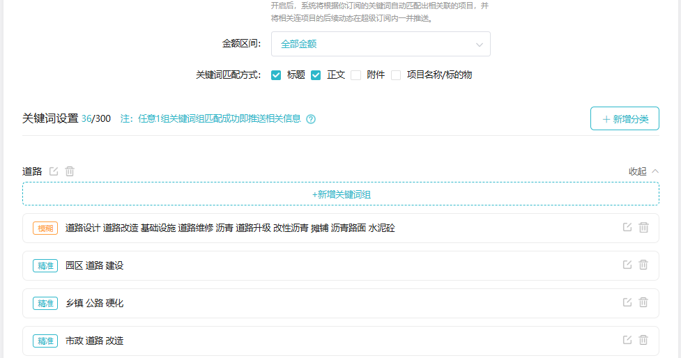 首次配置便超越基础关键词。剑鱼人员深入其业务场景,在“道路”之外,补充了“市政道路改造”、“乡镇公路硬化”、“园区道路建设”、“路面养护工程”等系列关联词,形成了贴近实际采购表述的关键词矩阵。同时,将区域、采购单位类型、信息类别进行锁定,确保系统从初始就瞄准靶心。