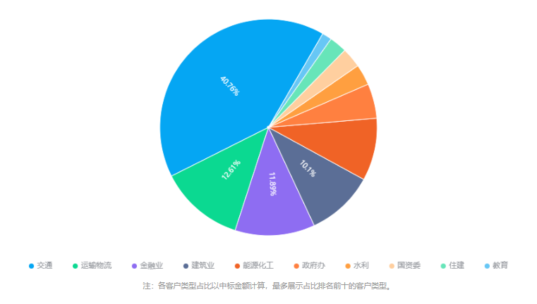 根据剑鱼标讯不完全统计,2024年,中铁十局集团有限公司中标项目金额达到320.35亿元,中标项目数量达到316个,覆盖全国30个省份,主要集中在山东、河南、安徽和浙江境内,中标总金额超过215亿元。客户订单集中在交通、运输物流、金融业和建筑业领域,占比超过75.36%。