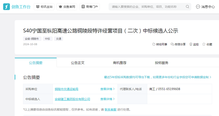 招采进度:通过剑鱼标讯数据分析,该项目在2024年9月9日发布了招标公告,于2024年10月8日发布了中标结果;