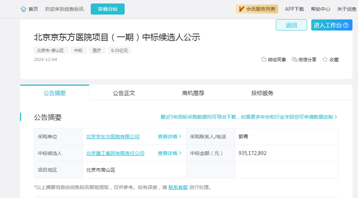 招采进度:通过剑鱼标讯数据分析,该项目在2024年10月22日发布了资格预审公告,于2024年12月4日发布了中标结果;