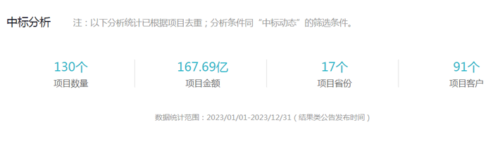 根据剑鱼标讯不完全统计,2023年,北京建工集团有限责任公司中标项目金额达到167.69亿元,中标项目数量达到130个,覆盖全国17个省份,主要集中在北京、河南、四川和广东省境内,中标总金额超过128亿元。客户订单集中在金融、建筑和制造业领域,占比超过60%。