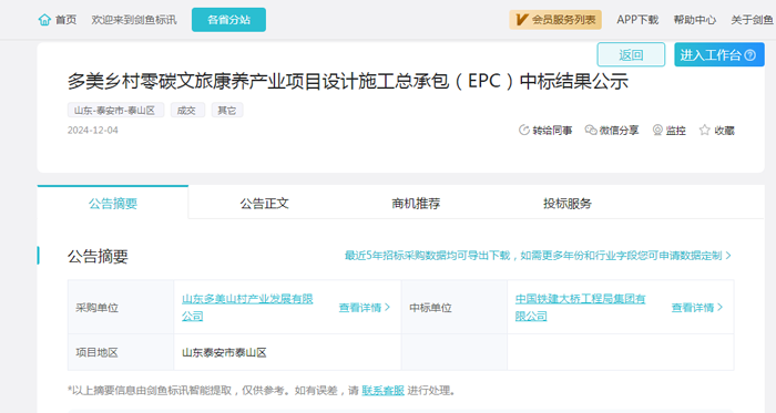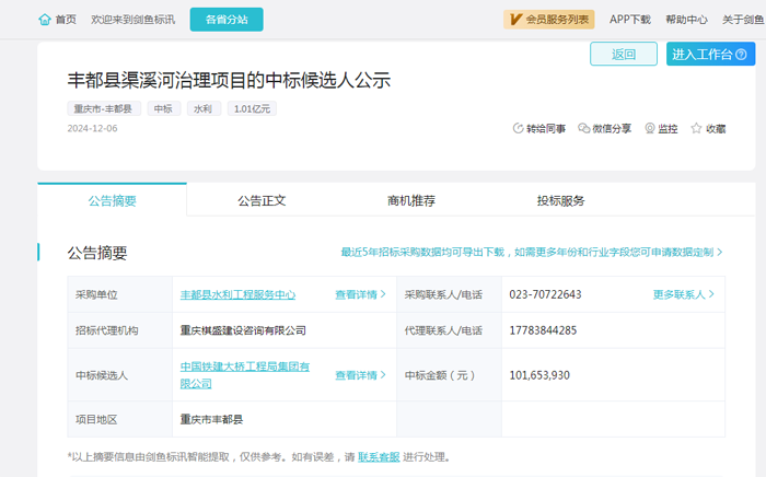 招采进度:通过剑鱼标讯数据分析,该项目在2024年10月23日发布了招标公告,于2024年12月6日发布了中标结果;