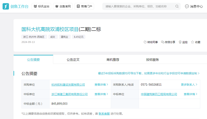 招采进度:通过剑鱼标讯数据分析,该项目在2024年8月9日发布了招标公告,于2024年9月13日发布了中标结果;