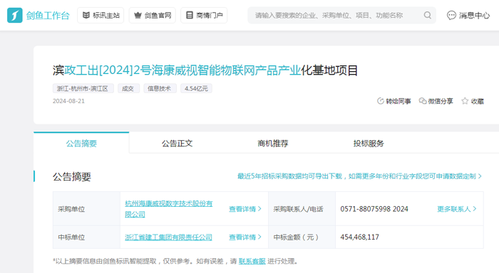 招采进度:通过剑鱼标讯数据分析,该项目在2024年7月2日发布了招标公告,于2024年8月21日发布了中标结果;