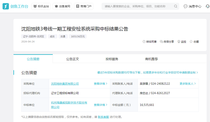 中标企业:杭州海康威视数字技术股份有限公司