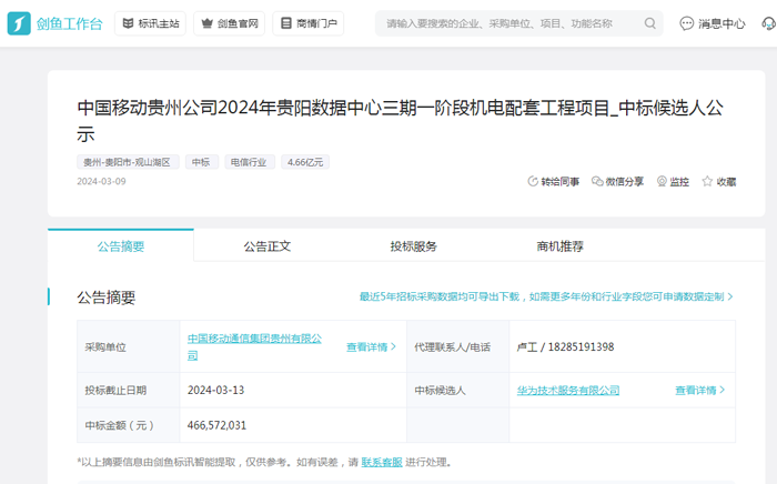 12024年3月份至今,华为技术服务有限公司连中三个超级大单,均为移动运营商项目,分别来自中国移动和中国联通,中标总金额达到10.12亿元。剑鱼标讯为您梳理项目重点信息。