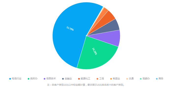 根据剑鱼标讯不完全统计,2023年,华为技术服务有限公司新签合同额达到42.79亿元,中标项目达到466个,分布在全国32个省份。主要集中在北京、上海和广东省。在客户类型方面,电信行业最多,占比达到53.78%,其次是政府项目和信息技术领域相关。