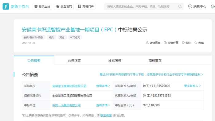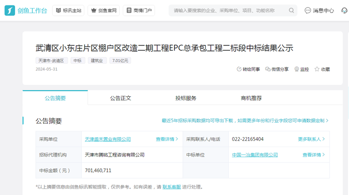 招采进度:通过剑鱼标讯数据分析,该项目在2024年5月8日发布了招标公告,于2024年5月31日发布了中标结果;