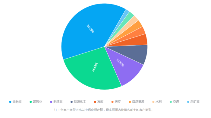 根据剑鱼标讯不完全统计,2023年,中国一冶集团有限公司新签合同额达到219.42亿元,中标项目数量达到204个,覆盖全国22个省份。主要集中在湖北省内,中标项目达到72个,中标金额突破44亿。其次是广东省和河南省。金融和建筑领域的客户订单贡献最多,占比超过64%,其次是制造业和能源化工领域。