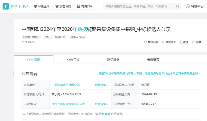 16月14日,从剑鱼标讯收录的标讯信息中得知,中国移动通信有限公司发布《中国移动2024年至2026年数据链路采集设备集中采购》中标结果公示,四家公司共同中标,总金额达到6048.27万元,详情请看下文。