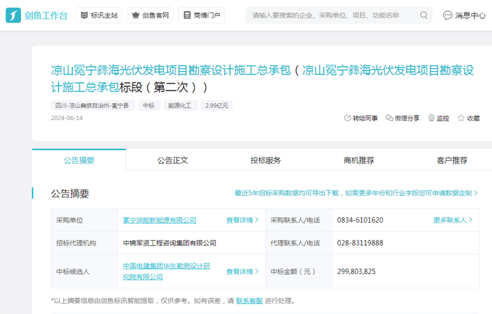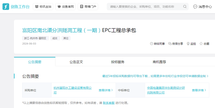 招采进度:通过剑鱼标讯标讯数据分析,该项目在2024年4月19日发布了招标公告,于2024年6月3日发布了中标结果;