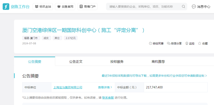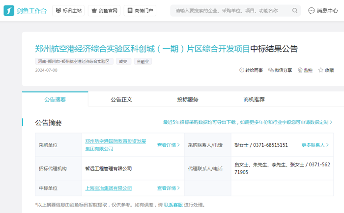 招采进度:通过剑鱼标讯数据分析,该项目在2024年6月7日发布了招标公告,于2024年7月8日发布了中标结果;