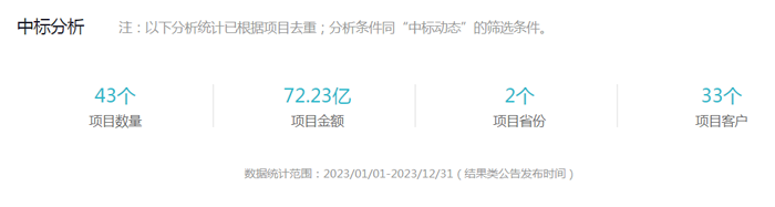 根据剑鱼标讯不完全统计,2023年,安徽建工集团股份有限公司中标项目金额达到72.23亿元,中标项目达到43个,分布在全国2个省份,主要集中在安徽省内。其中客户订单集中在金融和建筑领域,占比超过85%。
