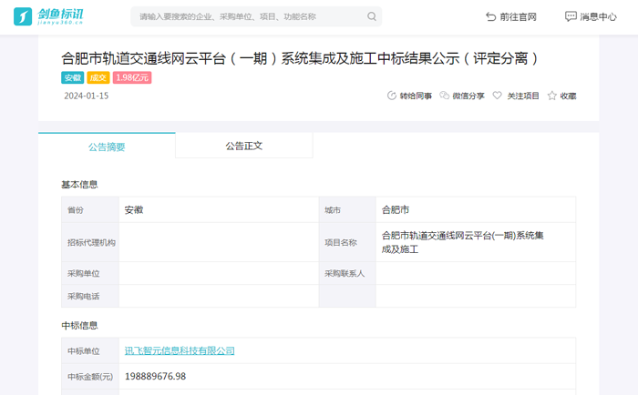 1月15日,从剑鱼标讯收录的标讯信息中得知,合肥市轨道交通线网云平台(一期)系统集成及施工中标结果公示出炉,讯飞智元信息科技有限公司以1.98亿元的价格成功中标。值得一提的是,讯飞智元信息科技有限公司是科大讯飞的全资子公司。