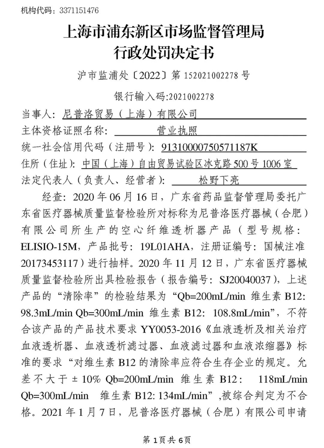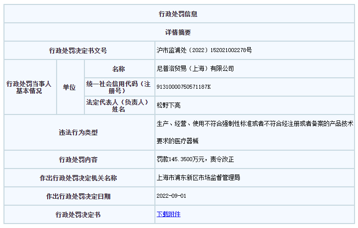 因尼普洛贸易(上海)有限公司生产、经营、使用不符合强制性标准或者不符合经注册或者备案的产品技术要求的医疗器械,上海市浦东新区市场监督管理局对其处罚145.35万元,并责令改正。