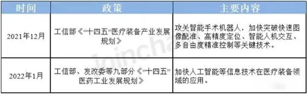 “十四五”规划以来,国家卫健委多次出台相关政策法规,大力支持手术机器人发展,加快人工智能等信息技术在医疗装备领域的应用。