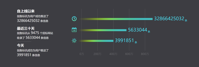 目前,剑鱼标讯构建了完整的数据采集、加工、存储线上化处理平台,实现了全天候不间断的自动化数据处理,数据库已达到亿万级,留存的标讯数据多达40+维度,可实现标讯数据随用随取。
